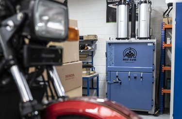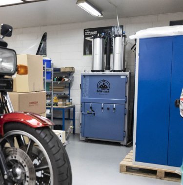 With the quick Mil-tek A406 pneumatic cardboard baler, Skjern Motorcycles has freed up valuable space and kept the workshop spotless.